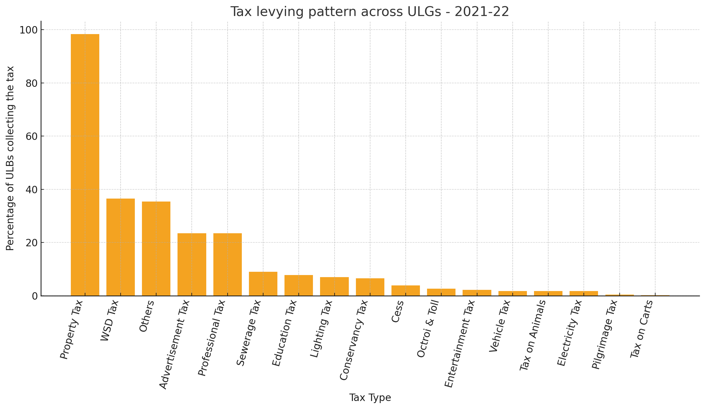Fig.1 highlights both the dominance of core revenue streams, such as property tax and the underutilization of other tax instruments across urban local governments. With 98% of the urban local governments levying property tax, it is an almost universal source of funding for cities. Water supply and drainage taxes (WSD Tax) are the second most levied tax, levied by about 36% of urban local governments, indicating the significance of utility-based fees in municipal tax revenue portfolios.