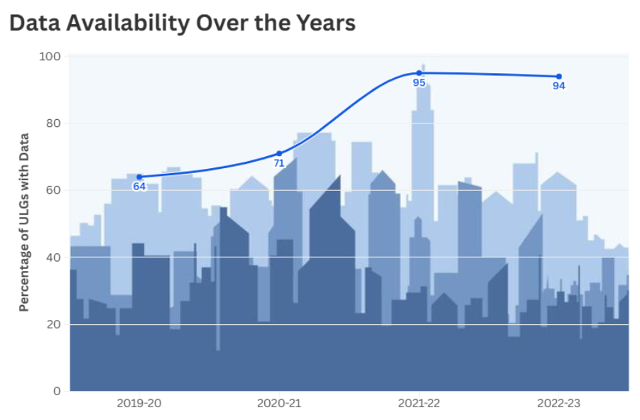 Looking at the figure, we can see that the percentage of Urban Local Governments submitting financial data has seen a dramatic rise, from just 64% in 2019-20 to 94% in 2022-23, reflecting the impact of the 15th Financial Commission’s reforms and the CityFinance platform. This steady increase in the number of cities submitting their financial statements, shows that more cities than ever are embracing transparency and public accountability in the way they manage their finances.