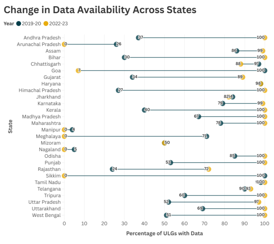 The above chart highlights the dramatic improvement in municipal data availability across Indian states, with 12 states reaching 100% coverage for Urban Local Governments by 2022-23 compared to much lower levels in 2019-20. The progress underscores the power of the focused financial transparency initiatives in bridging information gaps and enabling robust, evidence-driven urban governance.